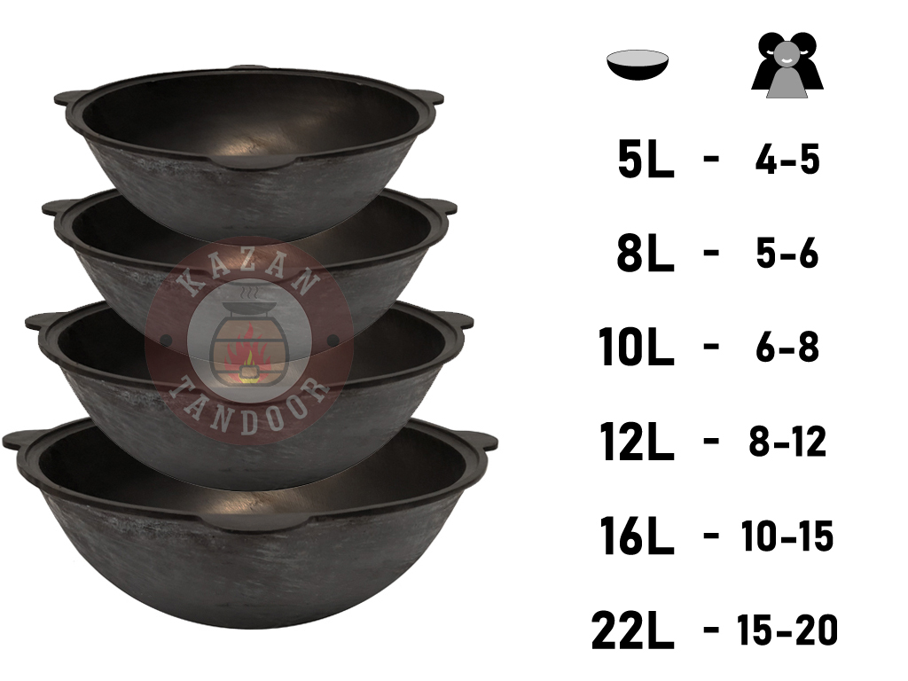 Można wybrać kociołki żeliwne 5, 8, 10, 12, 16 czy nawet 22 L. Zasada ILE OSÓB - TYLE LITRÓW jest najlepsza przy wyborze każdego kociołka. Zatem przy wyborze możemy kierować się liczbą osób, dla których będzie kociołek używany. Dla rodziny wystarczy kociołek 5 litrów, na 5 - 6 osób potrzebny kociołek co najmniej 8 litrów, na 10 osób warto wybrać kociołek o pojemności 12 - 16 litrów.